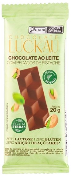 Produzida pela bem conceituada e especialista em chocolates, a Luckau, esta versão tem uma receita exclusiva zero poliol que preserva a pureza do chocolate ao leite (sem lactose) combinada com pedaços de pistache para um toque especial. O Chocolate ao leite com pedaços de Pistache. Livre de glúten, ovo, lactose, zero adição de açúcares e sem polióis.