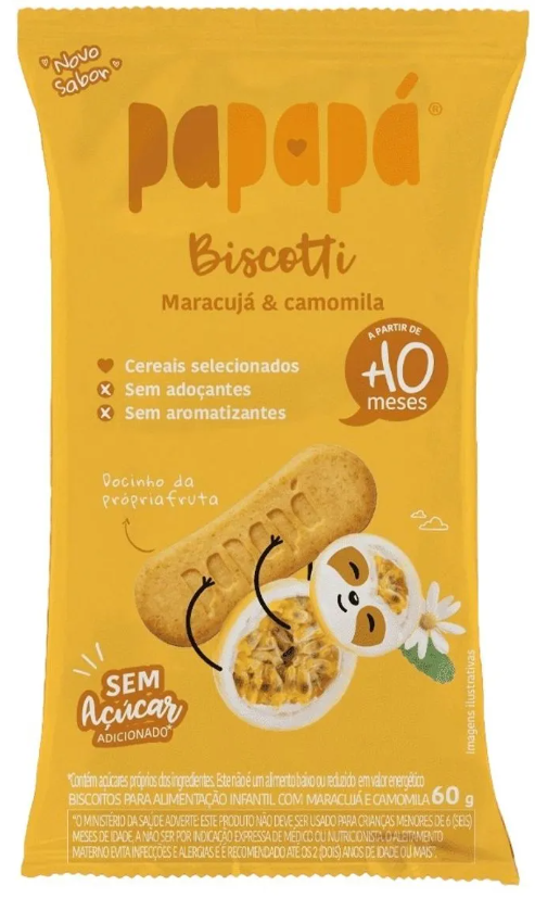 O Biscoito Infantil Biscotti vem em embalagem de 60g. É indicado para crianças a partir dos 10 meses que estão começando a experimentar alimentos sólidos. Sua fórmula livre de açúcar e aromatizantes destaca os ingredientes naturais, como o maracujá e a camomila, que oferecem sabor e cuidado para o delicado sistema digestivo dos pequenos.